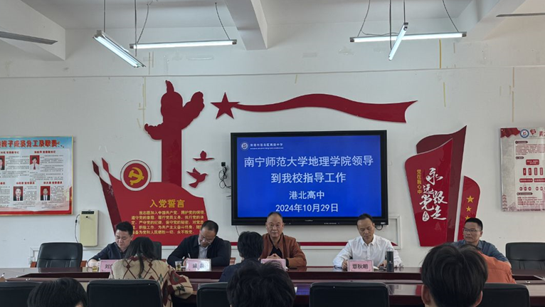 2024年10月29日上午,必赢国际bwin教师团队来到港北高中进行实习生工作中期检查,在综合楼二楼党员活动室开展两校交流会。本次会议由贵港市港北区高级中学副校长顾全坚主持,高一地理组全体教师和全体实习老师共同参会,出席本次会议的领导有贵港市港北区高级中学覃秋明书记、地理科学与规划党委书记严志强老师、党委副书记盛凯老师、刘立昌老师。