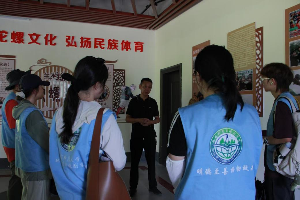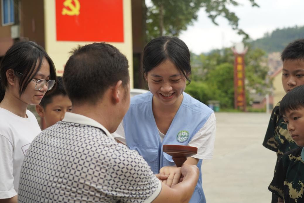 实践团参观走访了铜鼓坊、陀螺坊,白裤瑶陀螺技艺传承人向实践团展示传统陀螺玩法。