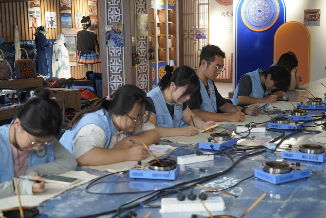 实践团在瑶族服饰非遗传承人、社区党支部书记黎秋亿指引下,先后参观社区染坊、织绣坊及白裤瑶生态博物馆,亲手绘制粘膏画,深入了解白裤瑶族历史渊源与民俗风情。