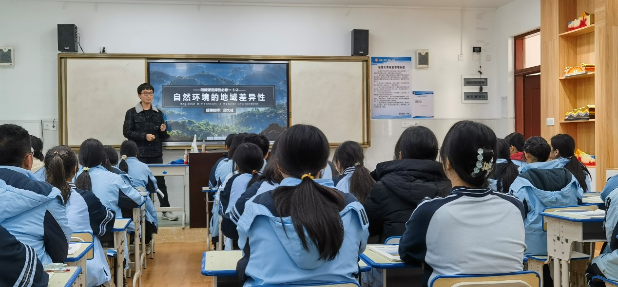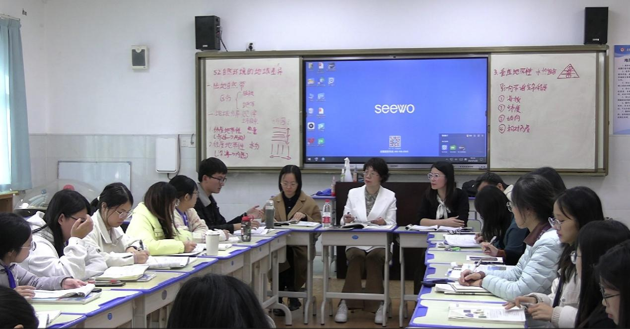 总结会结束后,廖伟业副教授、韦晨副主任等一行人一同前往高三楼三楼地理专用教室,一同听取贺佳丽同学《海洋与人类》和邱大成同学《自然环境的地域差异性》的汇报课来检验这段时间以来的实习成果。两节课课堂氛围良好,同学们积极配合,两位实习老师能够能够研读课标,整合教材,较好把控教学重难点,同时设计探究问题,在教学过程中较好落实地理核心素养与关键能力。