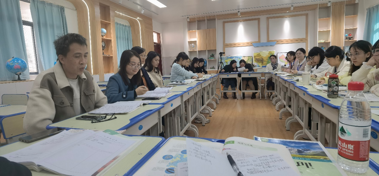 评课是一位新手教师成长的必经之路,从而更直观、更系统的总结和认识自己。在随后进行的评课研讨环节,两位执教实习老师首先对对教学设计与实施进行反思总结,然后,赵保华和李丽红两位指导老师先后对两位同学的备课、磨课以及讲课等进行详实且有针对性的点评,点明这两节课优势与不足所在,并提出宝贵的优化建议,部分地理组老师、部分实习生也依据自身见解与体会进行简要点评。随后,韦晨老师和廖老师分别从教学设计、教材内容处理、目标达成和素养落实等方面从亮点与不足两方面进行深入点评。