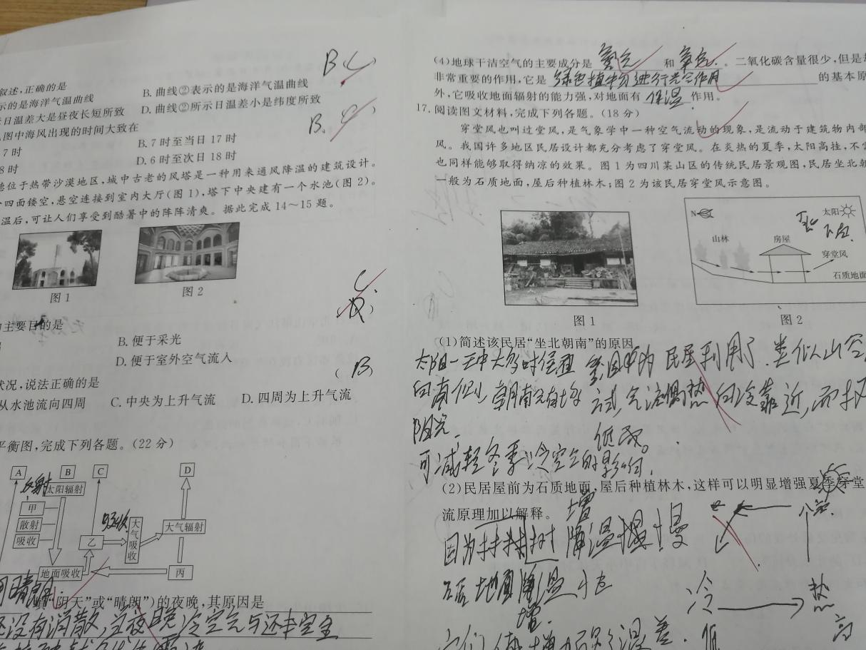 在改卷中我们发现学生对所学知识的掌握程度很低,在课堂上讲过的知识,在答卷时思维混乱,特别是对于大气受热过程中的两个作用对应的生活现象,以及大气热力环流的原理和过程。