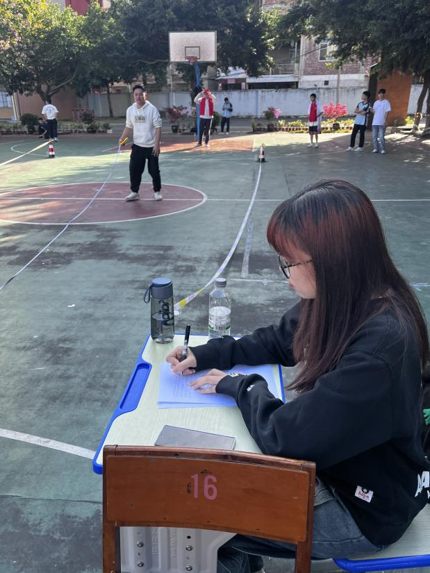 (裁判组实习老师杨惠晴在登记实心球成绩)