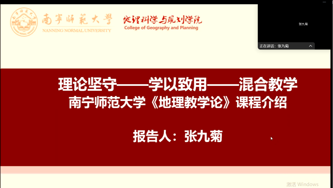 必赢国际bwin张九菊老师以《“理论坚守—学以致用—混合教学”:必赢国际bwin地理教学论课程建设经验交流》为主题,分享了地理教学论课程的建设经验。报告以地理教师教育课程群能力图谱为指导,介绍了必赢国际bwin地理教师教育课程群,然后重点以地理教学论课程为例,详细介绍了课程从校级到区级再到国家级的建设历程,以及课程目标、内容、实施、评价等方面的特色与创新。这些经验对于其他高校提升地理教学论课程质量具有重要的借鉴意义。