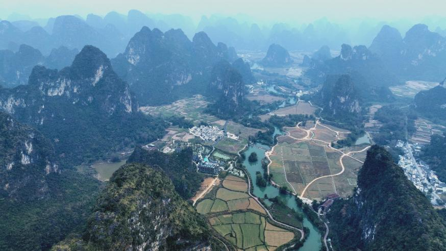 随后,同学们漫步明仕田园,共同欣赏独特的喀斯特地貌和优美的自然风光。明仕田园阡陌纵横,村落古朴,展现出宁静祥和的田园风光,峰峦叠翠,河流蜿蜒,清澈见底,倒映着蓝天白云,构成一幅幅美丽的山水画卷。