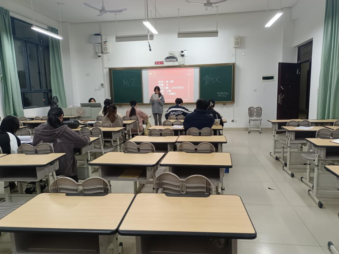 转正会议就张子婷、汪璐瑶、李婷、孙正淑四位中共预备党员能否如期转为中共正式党员的问题展开讨论。会议伊始,四位预备党员依次进行考察期总结,向党组织汇报在预备期间的思想、学习和生活等方面的情况,参会的党员同志结合各位转正同志的发言进行提问。与会正式党员进行无记名投票,大会一致同意接收张子婷、汪璐瑶、李婷、孙正淑四位预备党员转为中共正式党员。最后,全体党员起立,在党支部书记黄珊珊同志的带领下,面向党旗进行宣誓。