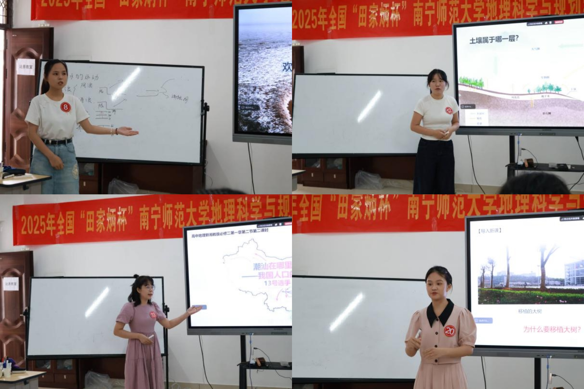 比赛过程中,20名研究生同台竞技,展现地理教学风采。选手按照顺序分为四组,围绕“大气的组成与人类活动”“海水的主要运动形式”“土壤的功能和养护”“我国人口的迁移”和”城镇化对地理环境的影响”五个选题进行备课与模拟授课。选手们将专业知识与教学技巧深度融合,通过情境案例引入,借助多媒体手段,巧妙设计课堂环节,呈现生动的课堂教学,充分展现出扎实的专业功底与出色的教学能力。