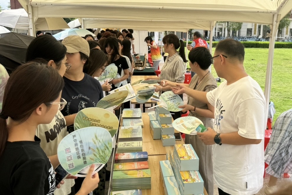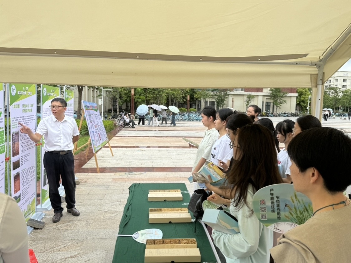 此次活动旨在通过沉浸式实践、趣味科普互动等形式,让同学们化身“土地探秘者”,深度触摸土地脉搏。活动现场,同学们手持宣传扇,站在摊位前,认真翻阅相关资料,与工作人员探讨土壤性质、土地利用等知识,增强了土地保护意识。现场还开设了展板知识讲解,工作人员从土壤本质、生活生产发展、国家政策等方面,介绍了土地保护的相关知识,同学们围站在展板旁认真聆听,不仅认识了各种土壤剖面,学习了如何区分不同土地的“年轮”,还了解了第三次全国土壤普查的内容和意义等。此外,活动还特备开设了答题环节,同学们在竞答互动中,加深巩固了对土地的认识,同学们纷纷表示收获匪浅。